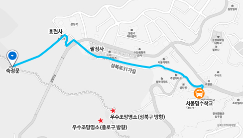 명수학교 정류장에서 도보로 숙정문 안내소로 가려면 성북로31가길로 진입하여 팔정사를 지나, 삼청터널이 보이는 대사관로에서 건널목을 건넌다. 삼청터널 방향으로 홍련사 입구를 지나서 바로 오른쪽 길로 진입해야 한다.