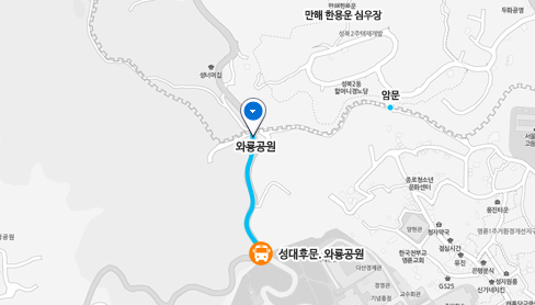 ㆍ안국역(3호선) 2번 출구 → 종로02(성대후문.와룡공원 하차) → 도보10분 와룡공원 → 한양도성 따라 도보 20분