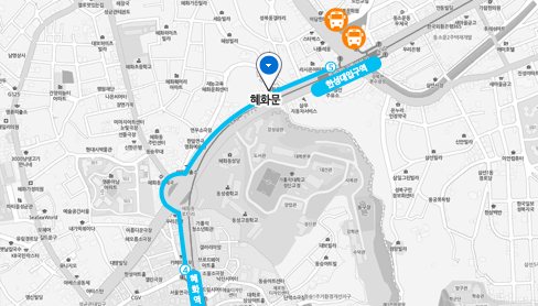 ㆍ혜화역(4호선) 1, 2번 출구 → 종로08(샘미용실 하차) → 도보10분 와룡공원 → 한양도성 따라 도보 20분